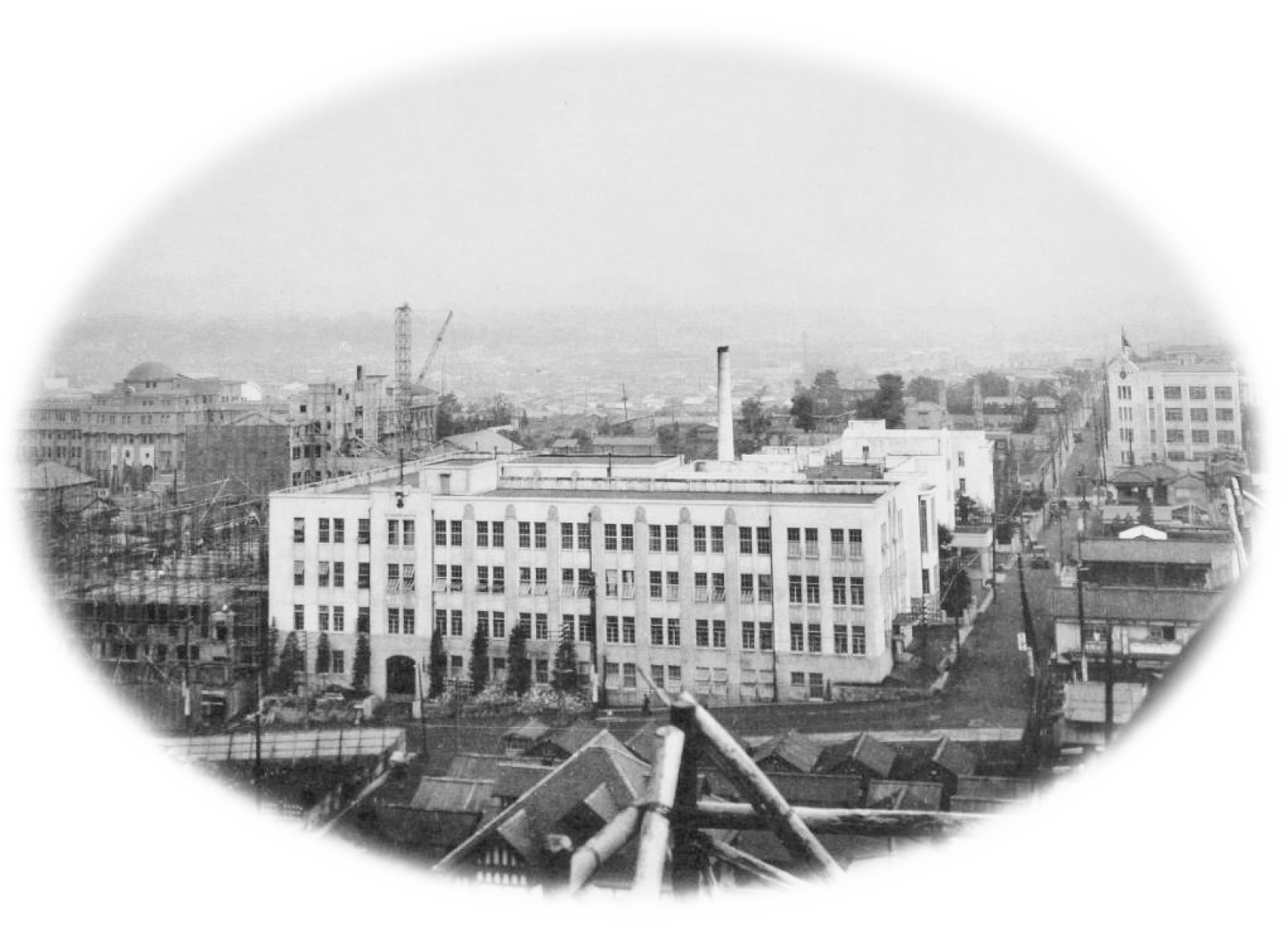 関東大震災の後1年6か月を経た大正14年(1925年)9月,専門部歯科,同附属病院,専門部医学科,高等工学校共用の駿河台新校舎が完成した(写真:第1回生卒業アルバムから)。左は建築中の工学部(当時)校舎(昭和4年竣工)。 当時医学科校舎はすでに開設されていた歯学科と同じ建物で,「1,2階が歯学科,3,4階が主に医学科でありました。病院とは臨床講堂でつながっており,学生は講堂の後方の校舎側から,患者は病院の2階側から出入りができた。」(有賀槐三先生の回顧) 医科を設けるには附属病院の建設が必須条件であり,病院建設は医学科校舎の建設と同時に進められた。大正15年8月末に附属駿河台病院が完成し,10月30日開院式が行われ,11月5日から診療が開始された。初代病院長は額田豊医学科長が兼任した。開院時の診療科目は内科・外科・産婦人科の3科であったが,昭和2年(1927年)4月には皮膚科・泌尿器科・小児科・耳鼻咽喉科・眼科・物療科が増設された。