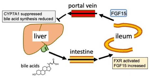 Fibroblast growth factor 15 (FGF15) is one of ileal hormones in rodents, and its ortholog in human is called FGF19. The production of FGF15 in the ileum is increased upon stimulation with bile acids, and the increase is due to activation of the bile acid receptor FXR. Based on the study using FGF15-KO and beta-Klotho-KO mice, the secreted FGF15 travels through the portal vein and stimulate FGFR4/beta-Klotho receptor complex in the liver, which is followed by repressed expression of CYP7A1, the rate-limiting enzyme in bile acid biosynthesis. This study clarified that FGF15 is a feed-back mediator to shut off bile acid biosynthesis shortly after FXR in the ileum detects significant amount of bile acids (Katafuchi et al. Cell Metab 2015).
