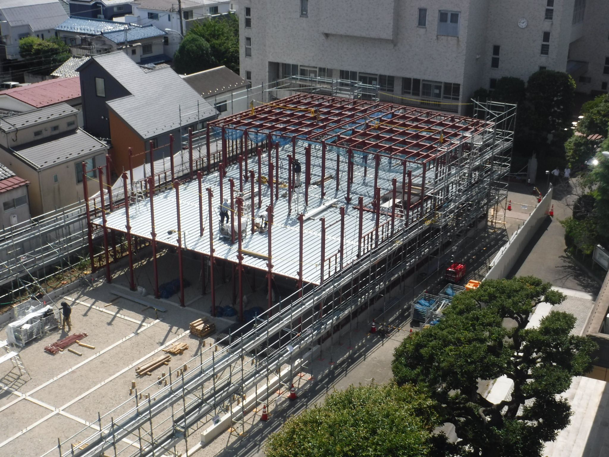 医学部仮設校舎建設のため,本館前広場の鉄骨工事を行っています。