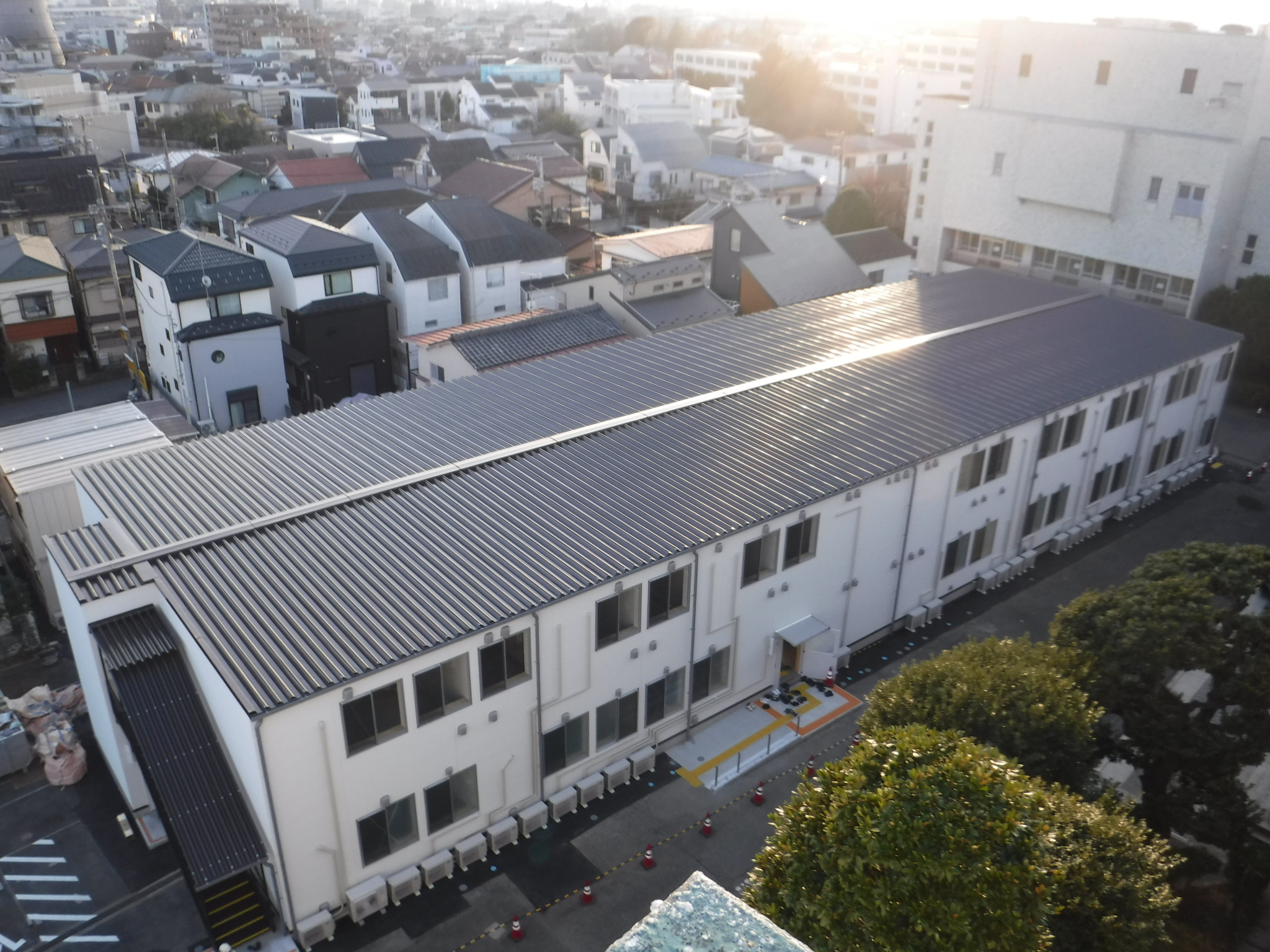 本館前広場の仮設校舎は竣工検査を迎えて,使用開始に向けて準備中です。
