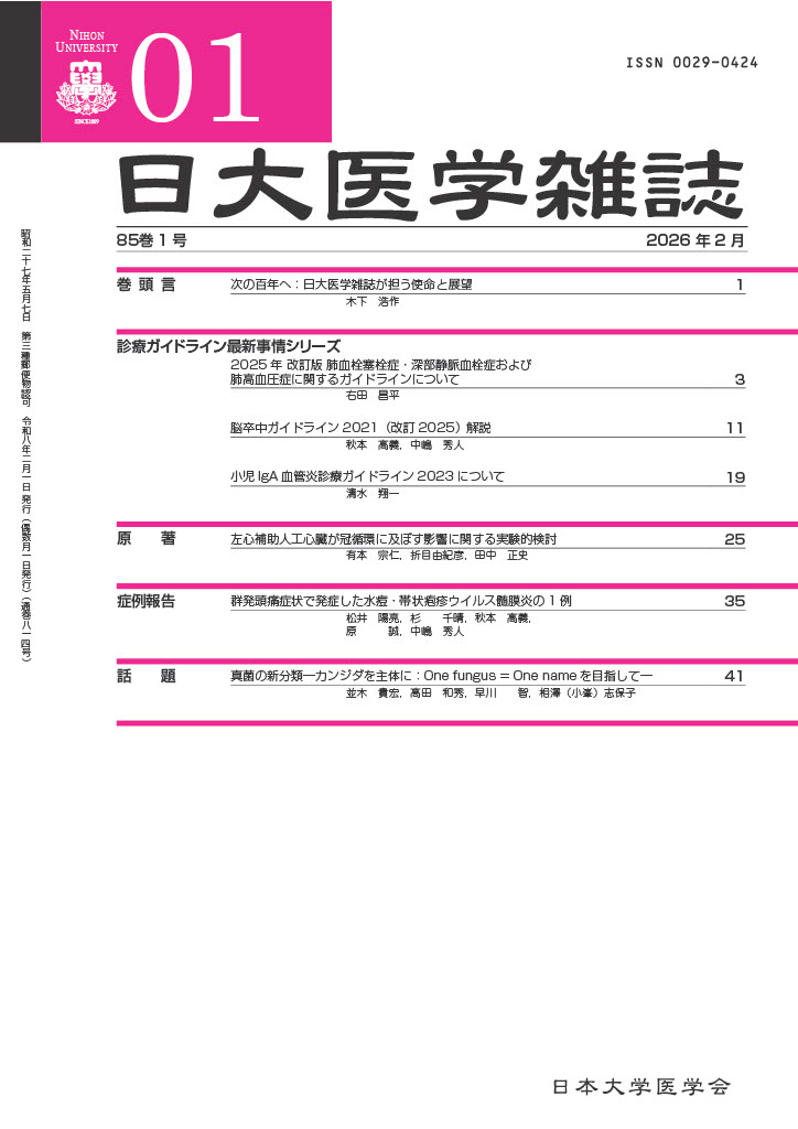日大医学雑誌は日本大学医学会の学会誌として,昭和12年に創刊され,今年2026年は85巻を発行しております。