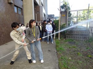 学生達は、緊張しながらも真剣に取り組んでいました。 これからの学生生活が楽しみな様子です。 <学生心得の説明> <警察署による防犯講和> <放水訓練> <避難経路の確認>