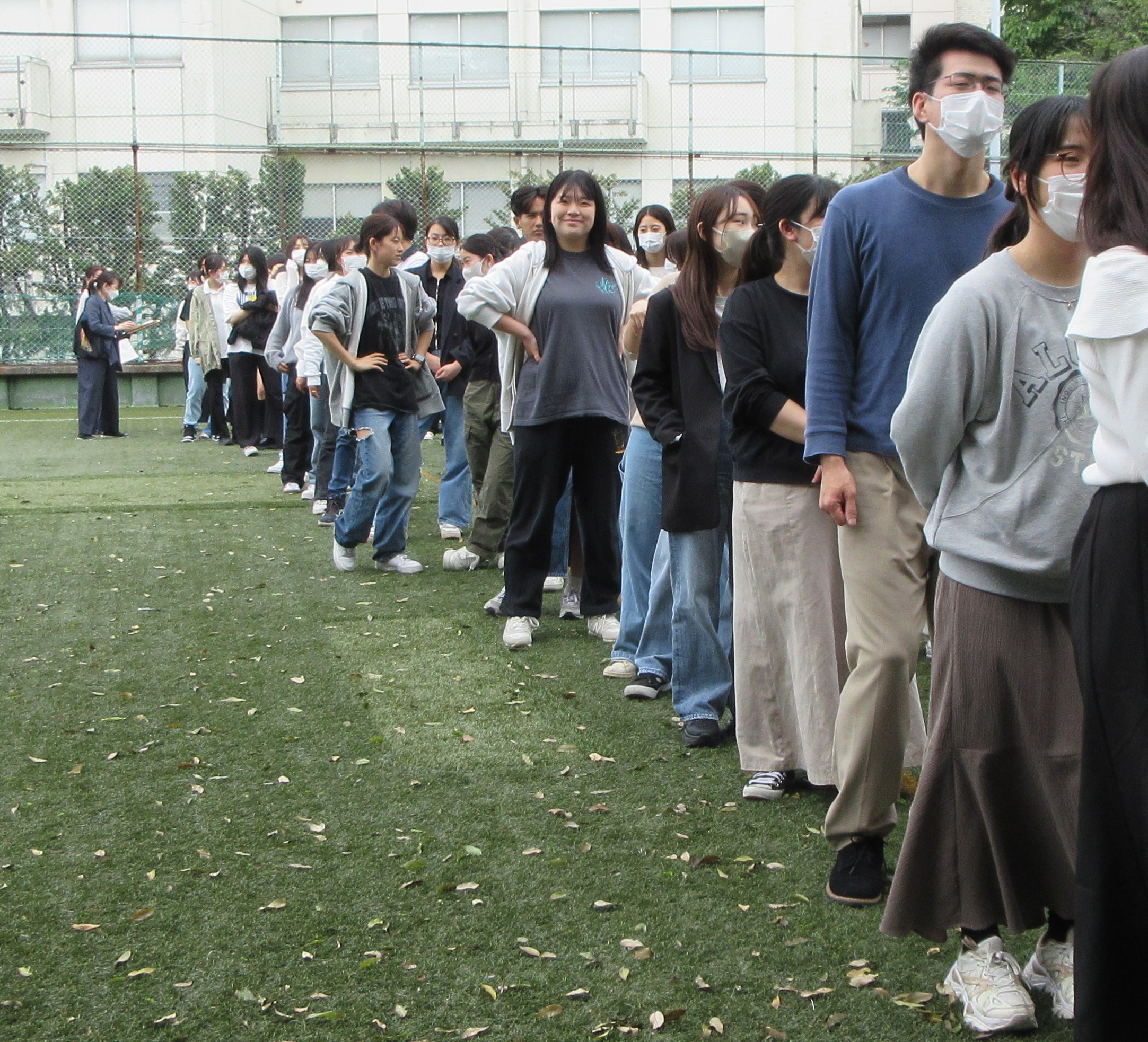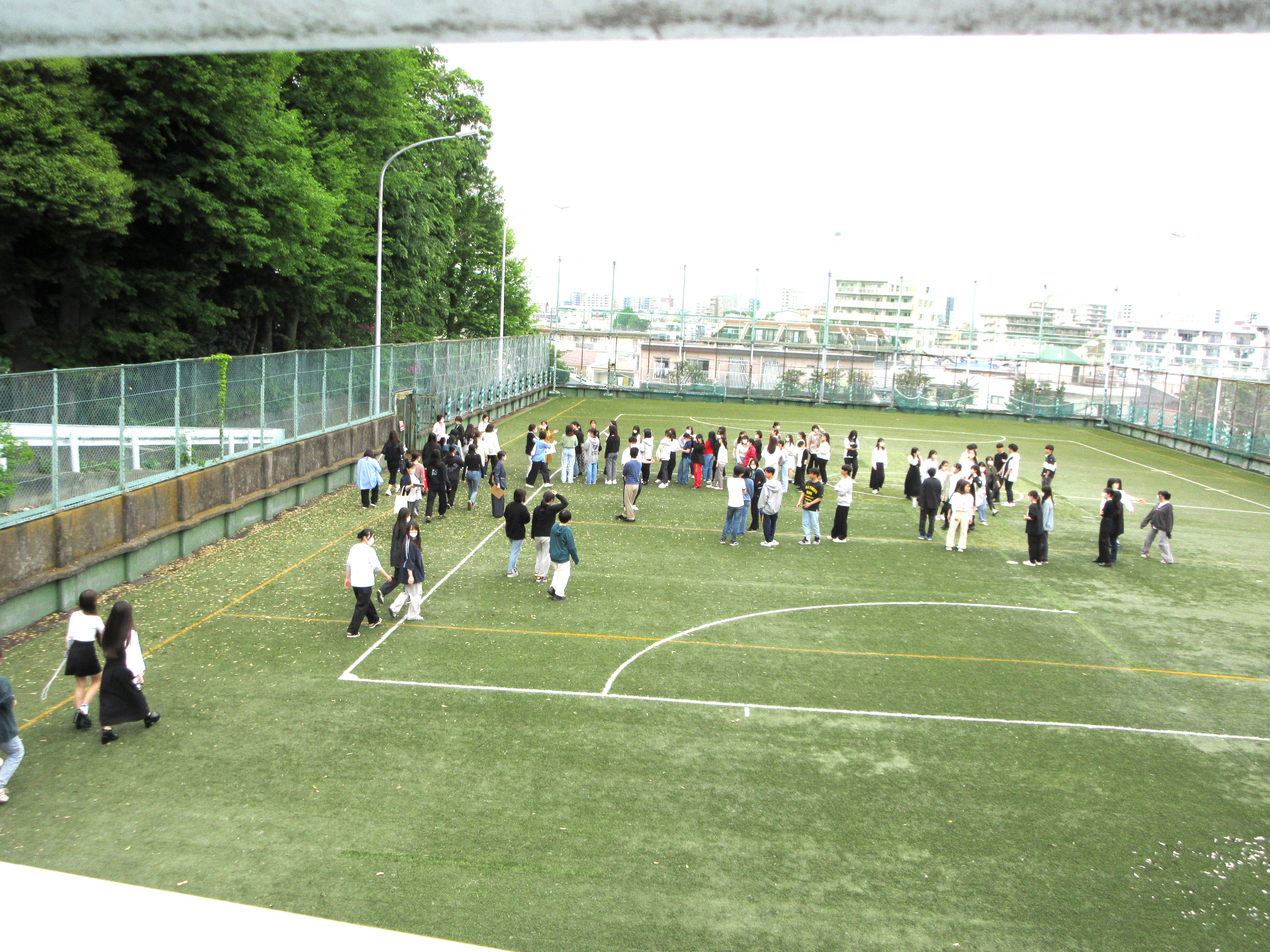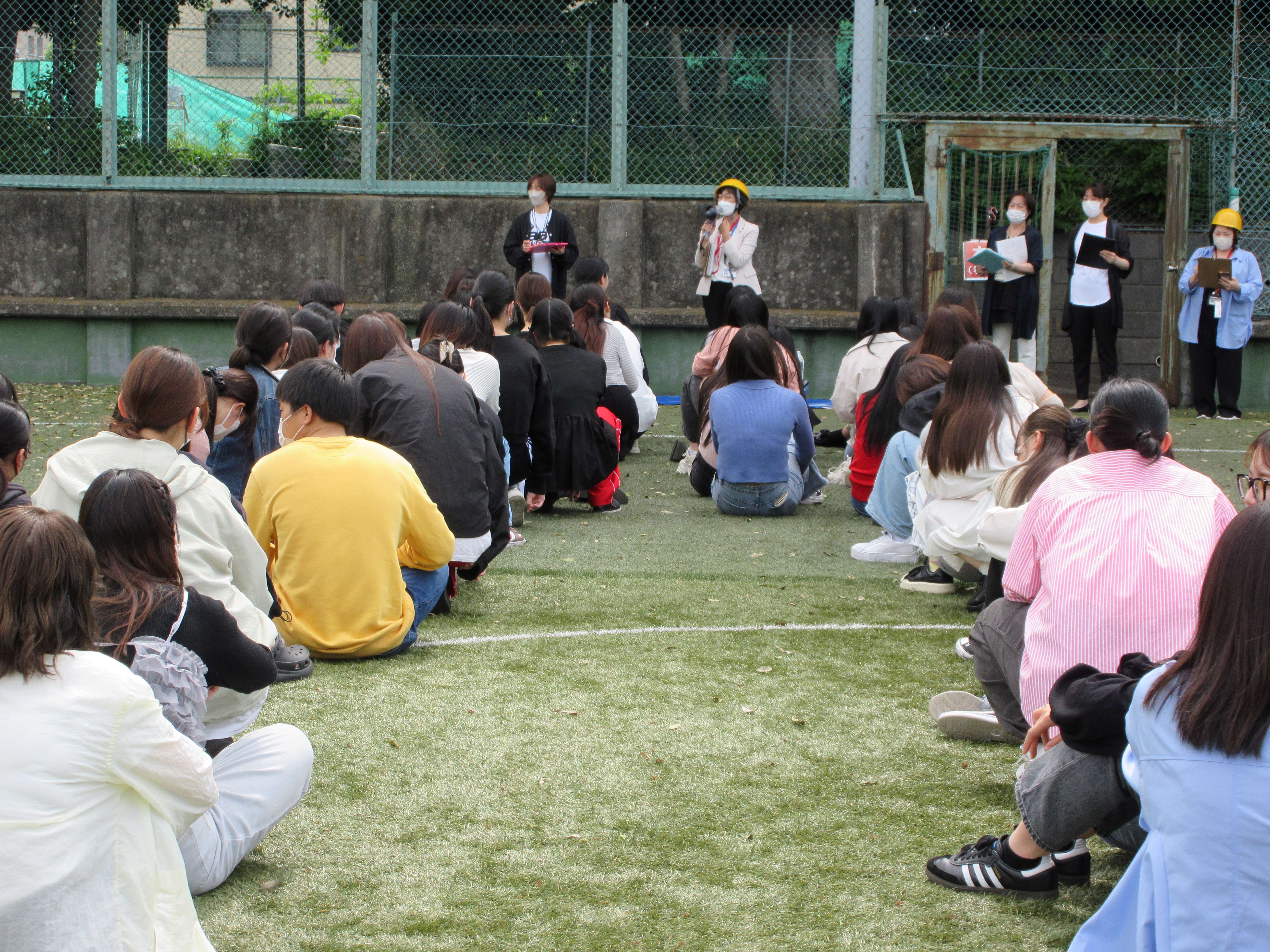 4月30日(月)に地震を想定した災害対処訓練を行いました。日々利用する教室,実習室,ロッカールームから避難し,グラウンドまでの避難経路の確認を行いました。5分ほどで全員グラウンドへ避難出来ました。 1年に一回の訓練ですが,落ち着いて行動できていました。 グラウンドへの避難の様子。 静かに点呼をとっています。 安否確認の報告中。全員無事です。