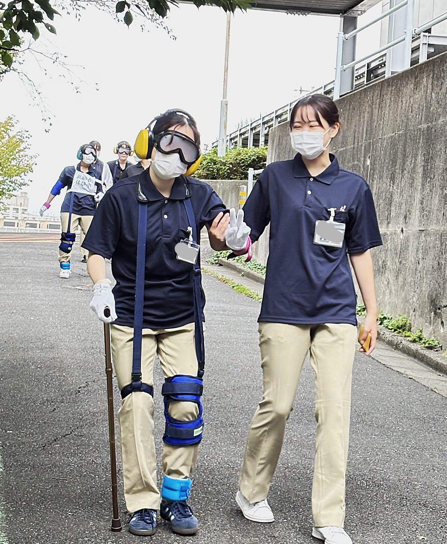 2年生の学生たちが老年看護学の学内演習で高齢者体験を行いました。