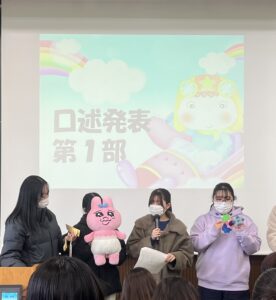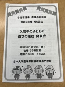 1月19日(月)、小児看護学看護の方法Ⅱにおいて、病気や療養中の子どもへの学習および遊びの援助を目標とした発表会を行いました。